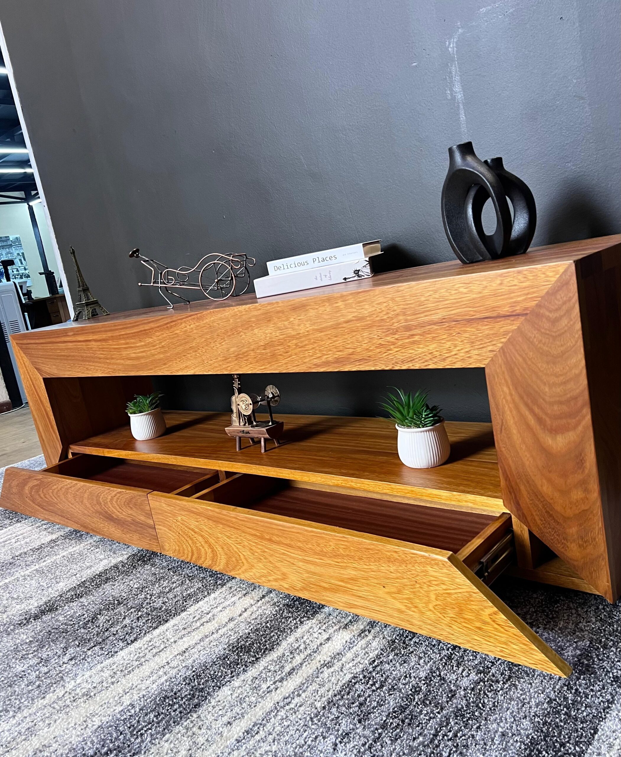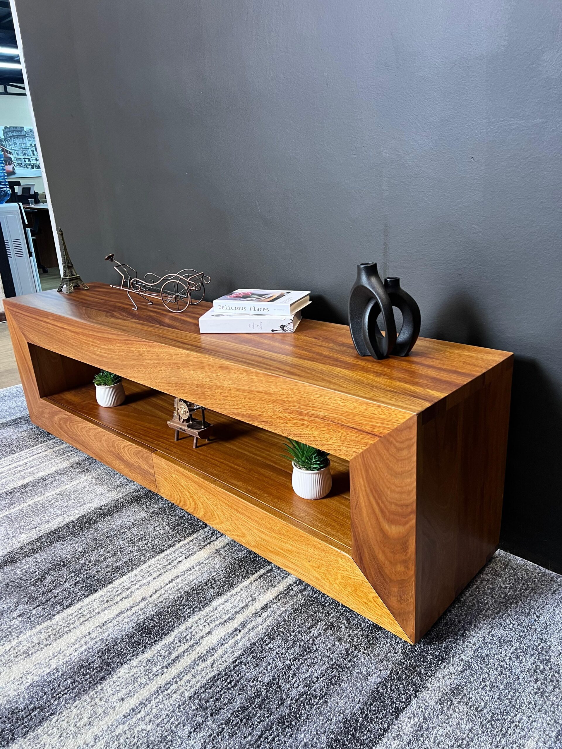 A bold mvule tv stand designed with a blocky ,architectural silhouette.Its solid structure highlights the rich natural grain and durability of mvule.