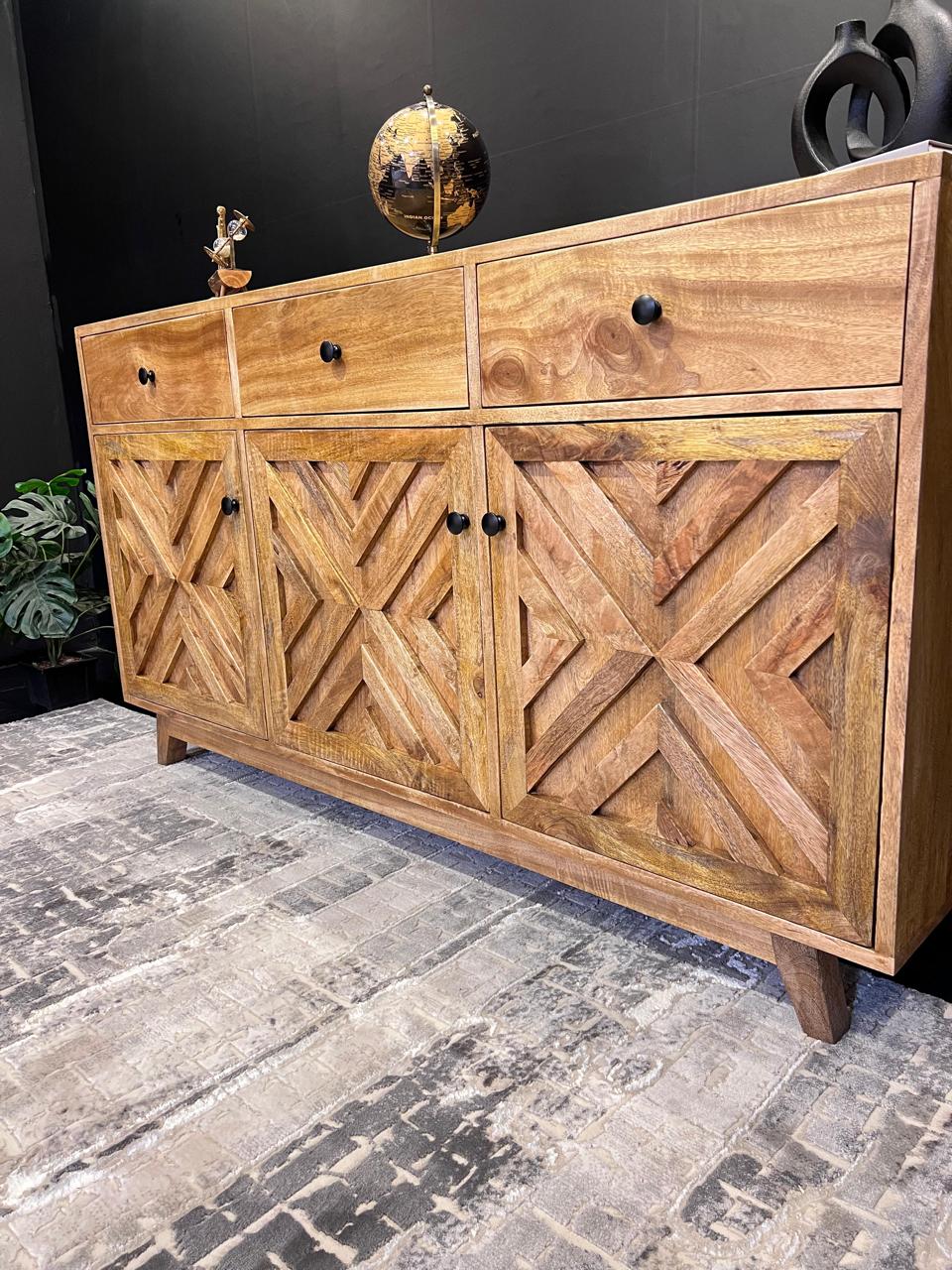 A mango wood console highlighted with beautifully patterned doors and sleek black knobs.Its natural finish and textured detailing add depth and character to the design.