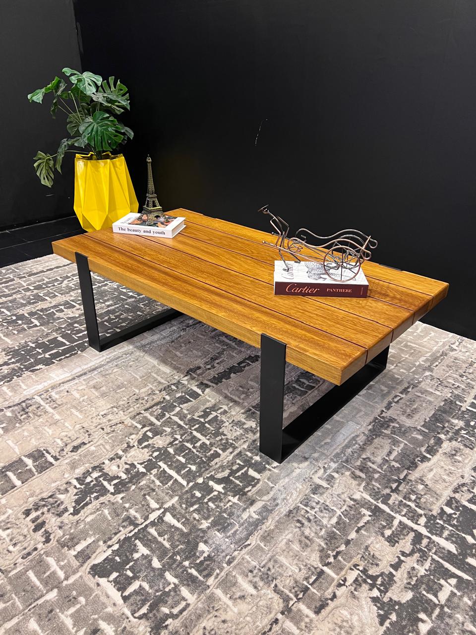 A refined rectangular coffee table made from luxurious mvule wood.Its reach natural grain is beautifully complex by polished metallic legs.
