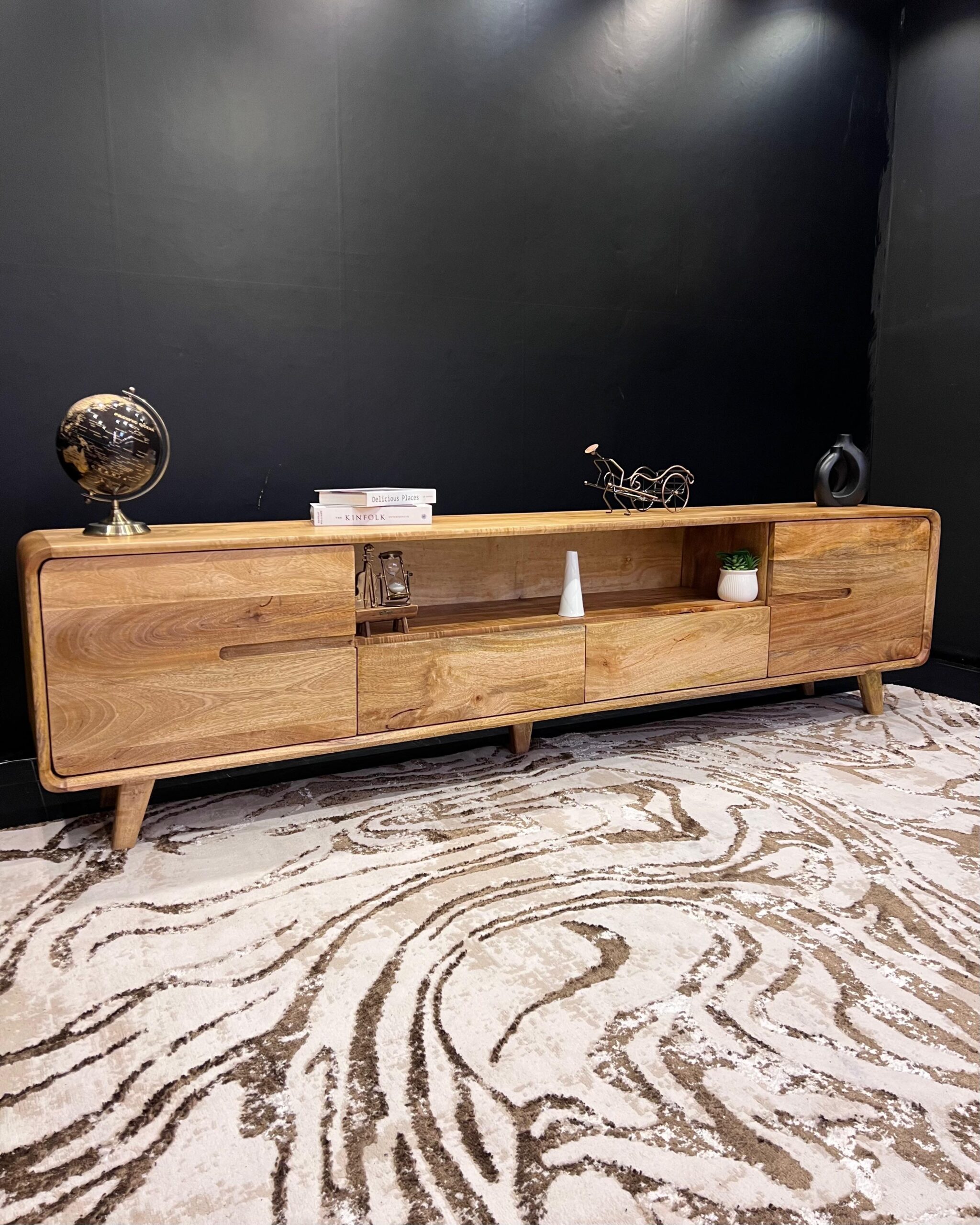 A simple mango wood tv stand,with two doors and two drawers ,providing practical and stylish storage.